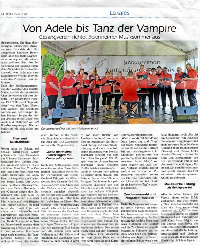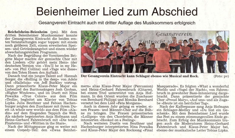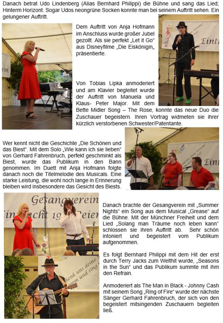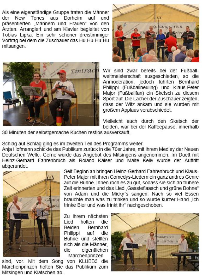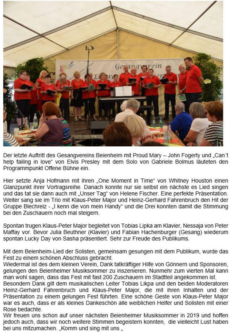 Durch das Programm führten Klaus-Peter Major, Manuela Major, Heinz-Gerhard Fahrenbruch, die auch als Solisten auftraten. Weitere Solisten waren Anja Hofmann, Kirstin Scharf, Petra Maier, Helge Lipka, Bernhard Philippi, Tobias Lipka und Rolf Janßen. Petrus hatte ein Einsehen und ließ die Regenwolken weiterziehen, sodass alle Teilnehmer abends, nach dem letzten Vortragslied des Gesangvereins Beienheim über Freundschaft »The way old friends do«, nach Hause zurückkehrten - vielleicht mit einem Summen auf den Lippen.