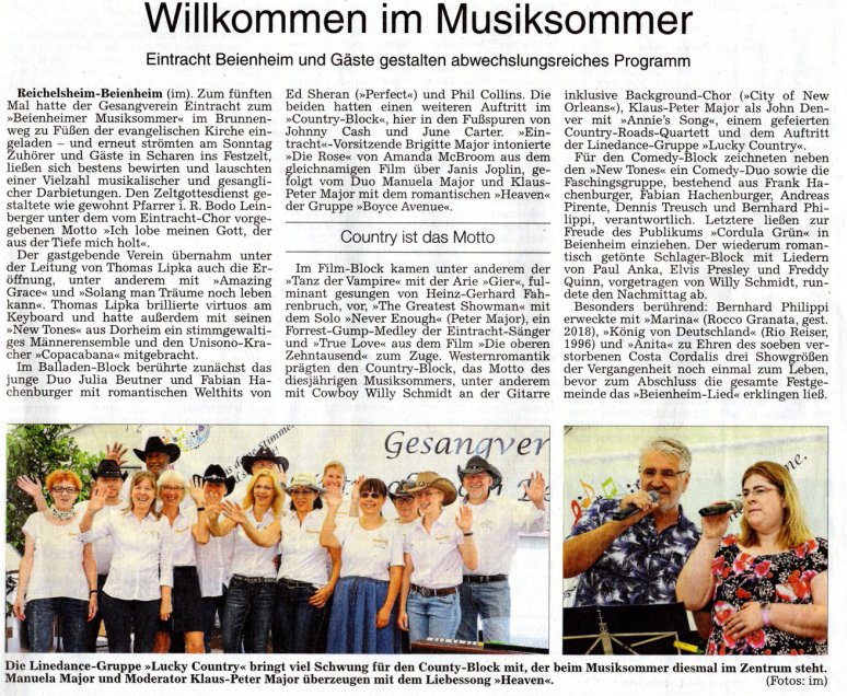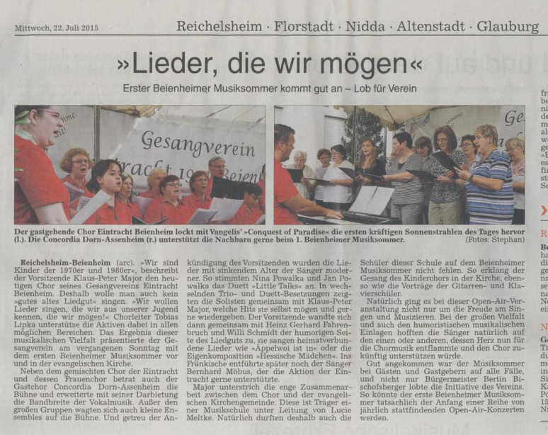 Reichelsheim-Beienheim (pm). Der Gesangverein Eintracht 1921 Beienheim hat mit seinem traditionellen Musiksommer dieses Jahr in die aufregende Metropole New York entführt. Unter dem weit ausladenden und schattigen Lindendach des Bürgertreffs wurde mit einem kurzen, sehr ansprechenden und fröhlichen Gottesdienst unter freiem Himmel begonnen, gehalten von Pfarrer i. R. Hartmut Miethe. Die Texte und Noten der geplanten Lieder wurden für alle zum Mitsingen verteilt.Ein stimmungsvolles Konzert erwartete die Besucherinnen und Besucher in der kleinen, sonnendurchfluteten Dorfkirche zu Beienheim. Der Gesangverein Eintracht Beienheim hatte - wie alljährlich - zum Hören, Genießen und auch Mitsingen eingeladen. Wochenlang probten die Sängerinnen und Sänger mit Chorleiter Tobias Lipka intensiv, um ein vielfältiges, weihnachtliches Programm zusammenzustellen.