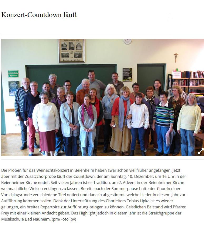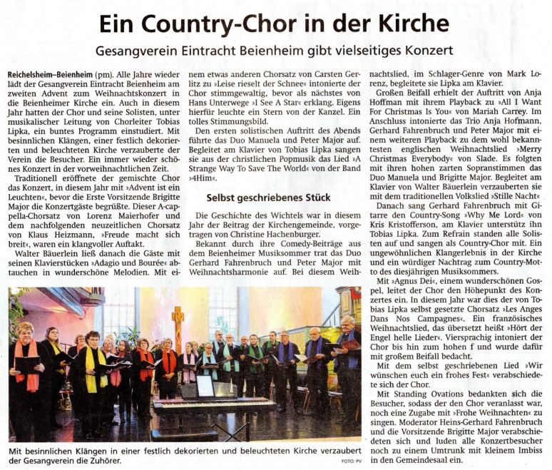Reichelsheim (pm). Ein stimmungsvolles Konzert erwartete die Besucherinnen und Besucher in der kleinen, sonnendurchfluteten Dorfkirche zu Beienheim. Der Gesangverein Eintracht Beienheim hatte - wie alljährlich - zum Hören, Genießen und auch Mitsingen eingeladen. Wochenlang probten die Sängerinnen und Sänger mit Chorleiter Tobias Lipka intensiv, um ein vielfältiges, weihnachtliches Programm zusammenzustellen.