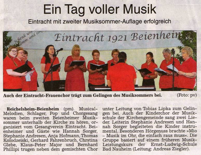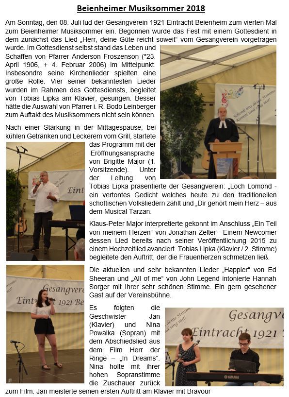 Nunmehr zum 101-jährigen Bestehen ist es endlich soweit, der Gesangverein Eintracht Beienheim kann und plant wieder einen Beienheimer Musiksommer auszurichten. Pandemie bedingt war es uns 2020 und 2021 nicht möglich unseren Musiksommer zu veranstalten. Ebenso fiel 2021 die Feier zum 100-jährigen Bestehen aus. Jetzt, nach zweijähriger Abstinenz, wollen wir unser beliebtes „Open Air Fest“ den Beienheimer Musiksommer wieder präsentieren. Hiervon umrahmt wird auch unser Jubiläum entsprechend gewürdigt werden. Stattfinden wird er am Sonntag, dem 10. Juli im Festzelt vor der Beienheimer Kirche. Beginnend mit einem Gottesdienst ab 11:00 Uhr. Danach folgen umfangreiche Aufführungen. Es werden außer dem Gesangverein wieder viele Gruppen und Solisten auftreten und so ein bunter Mix aus den Genre Pop, Rock, Schlager, Musical und Comedy zur Aufführung kommen. Zusätzlich mit Leckerem vom Grill, kühlen Getränken sowie Kaffee und Kuchen wollen wir unseren Gästen einen schönen und unvergesslichen Sommersonntag präsentieren. Ebenfalls hoffen wir mit unserem diesjährigen Motto,