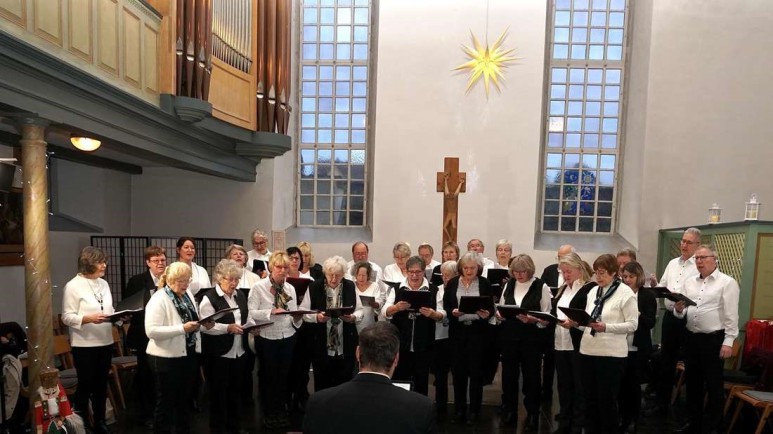 Nach den Begrüßungsworten der Vorsitzenden Brigitte Major folgte »Weißer Winterwald« nach einem Chorsatz von K.-H. Steinfeld. Darauf sangen die New Tones drei stimmungsvolle Lieder, darunter »Ein neues Weihnachtslied«. Nach dem Solo von Anja Hofmann »The best side of life« ging es für die Eintracht auf die Empore, wo zur beeindruckenden Begleitung des Organisten Udo Franzke an der neu installierten Orgel das unter die Haut gehende »Ave Verum Corpus« erklang. Durch das Programm führte Manuela Major, die die Solistinnen und Solisten Anja Hofmann, Heinz Gerhard Fahrenbruch, Brigitte Major und Klaus Peter Major ansagte. Auch sie selbst trug zwei Soli virtuos in der gut besuchten Kirche vor. Heinz Gerhard Fahrenbruch sang »Christus der Herr wurde uns geboren« nach einer Melodie, die von Michael Holm bekannt ist. Klaus Peter Major entführte das Publikum über den großen Teich mit »Bells of New York City«. Eine besondere Überraschung war das Duett »Maria durch ein Dornwald ging«, gesungen von Brigitte Major (Sopran) und Udo Franzke (Tenor), der auch auf der Orgel begleitete.