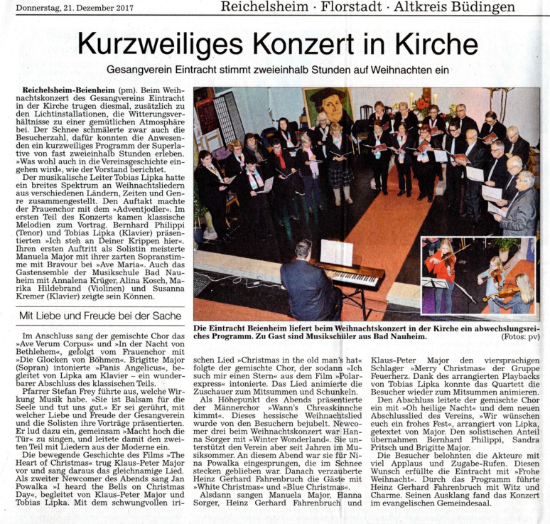 Die Sängerinnen und Sänger der »New Tones« aus Dorheim bereicherten das Repertoire dieser Veranstaltung. Das Konzert begann mit dem bekannten Lied »Immer wenn es Weihnacht wird«, gesungen von der Eintracht 1921 Beienheim « - nach einem Satz von Lorenz Maierhofer.